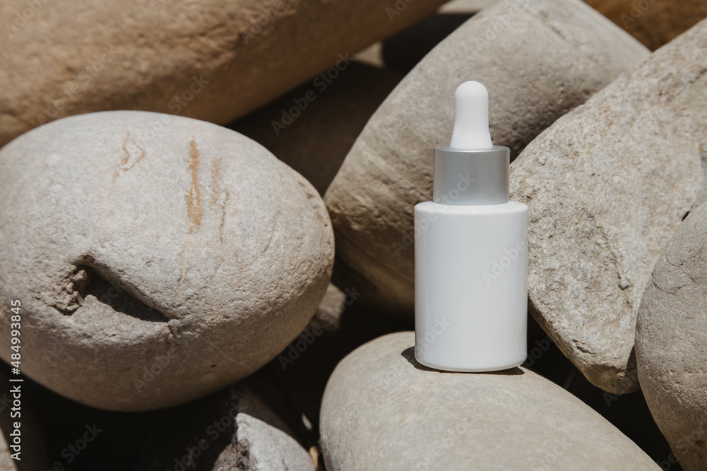 White bottle with a pipette on a stone background.Cosmetic bottle with pipette standing on the stone.White glass bottle