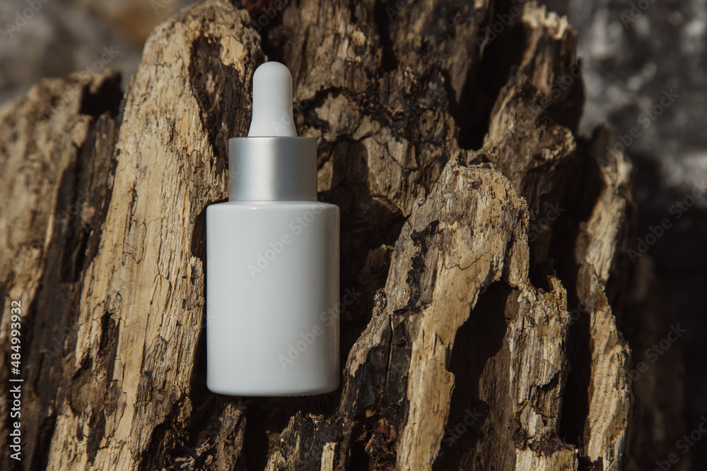 White glass bottle with a pipette on a wooden driftwood, brown background, natural cosmetics for body skin care.White glass bottle