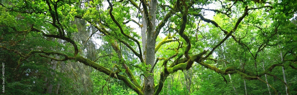 Close-up of mighty sorcerer oak tree in the green deciduous forest (public park). Atmospheric summer landscape. Pure nature, ecology, environmental conservation. Europe. Mystery, mythology, fairy tale
