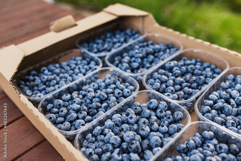 Box, crate or container with collected fresh blueberries. Berries agriculture business. Farmer cultivating and harvesting blueberry. Horticulture industry. Healthy eating concept. Blurred background