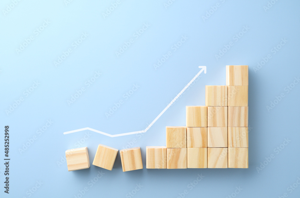 wood blocks in graph shape with arrow on sky blue background with copy space , business concept