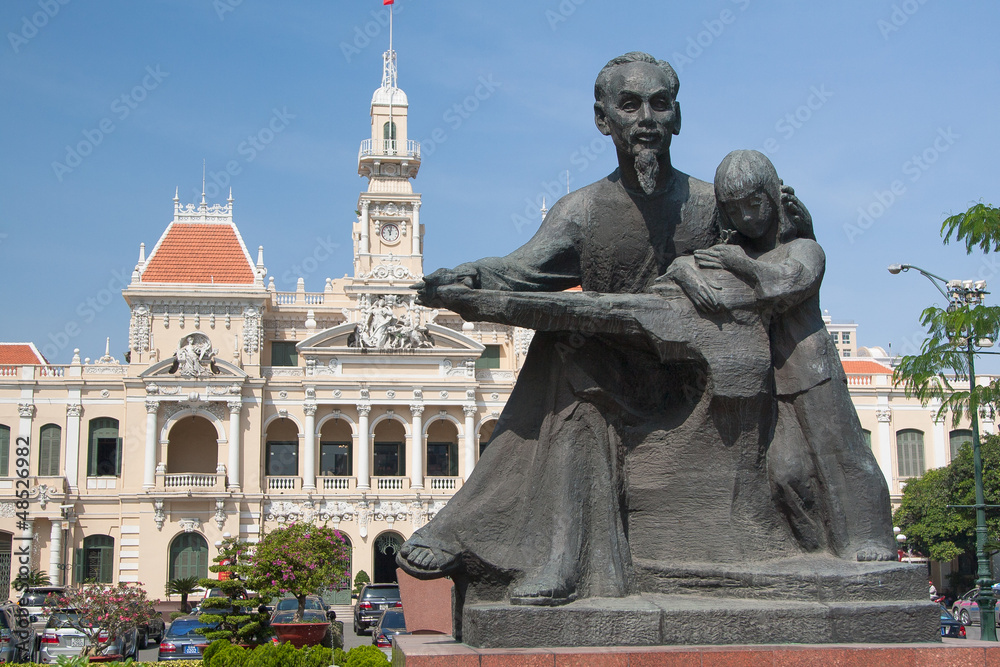 Statue Ho Chi Minh with a girl and Post Office in Saigon