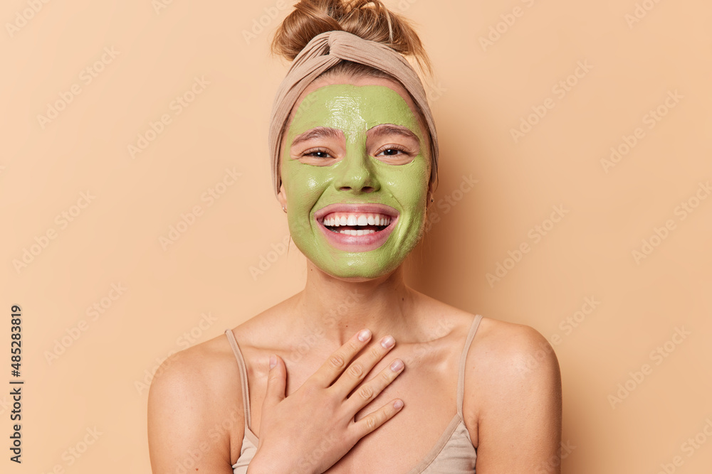 Happy European woman smiles broadly keeps hand on chest applies nourishing green mask undergoes beauty treatmentss wears headband has combed hair isolated over brown background. Skin care concept