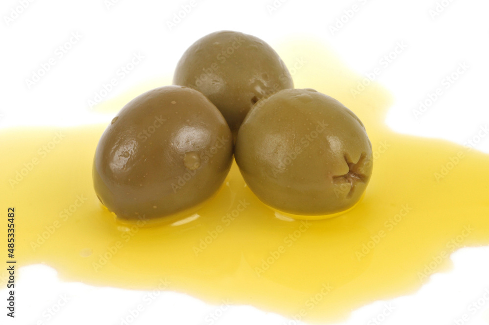 Olives vertes dénoyautées dans de l'huile d'olive en gros plan sur fond blanc