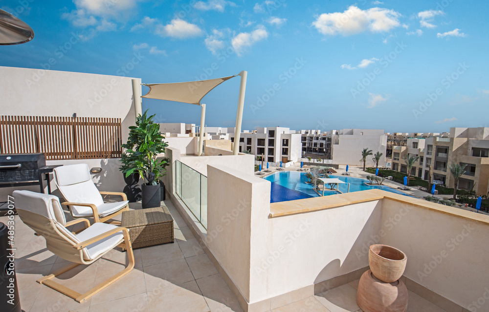 Roof terrace patio with chairs in tropical luxury holiday villa