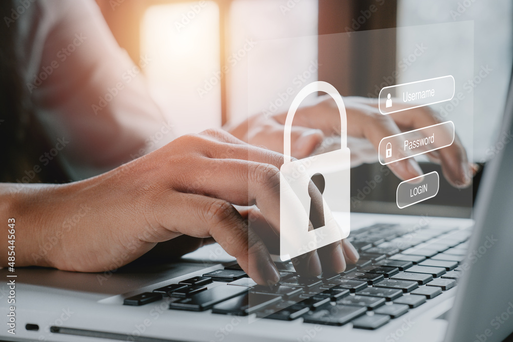Woman hand typing on keyboard with login and password on screen display, cyber security concept, data protection and secured internet access.