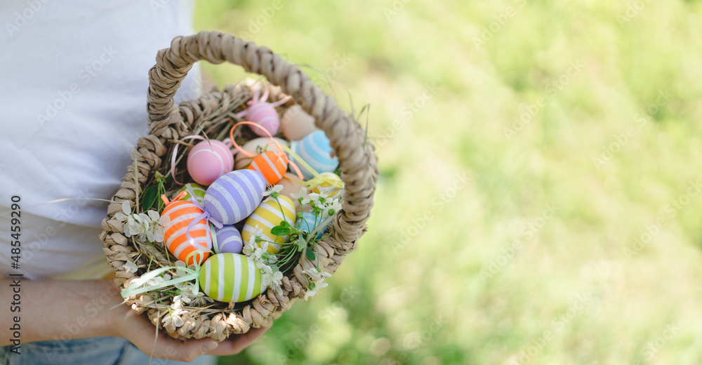 Easter egg hunt in spring garden. Funny teen girl with eggs basket and bunny ears on Easter egg hunt in sunny spring garden. Celebrating Easter. Happy easter card