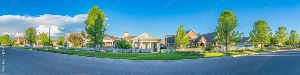 Panoramic view of houses with picket fence and different structures at Daybreak in Utah
