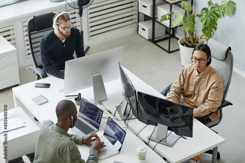 Group of young intercultural diversity programmers developing new programs in contemporary development bureau