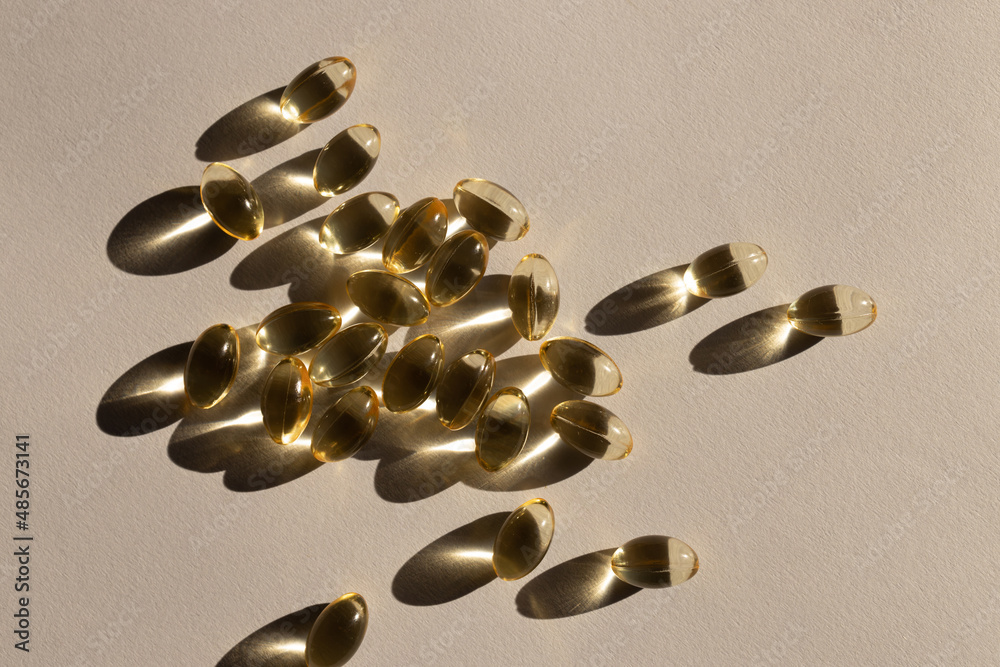 Vitamin D3 omega fish oil capsules.Close up of Vitamin D3 Omega 3 fish oil capsules on beige background.Fish oil vitamin for healthy