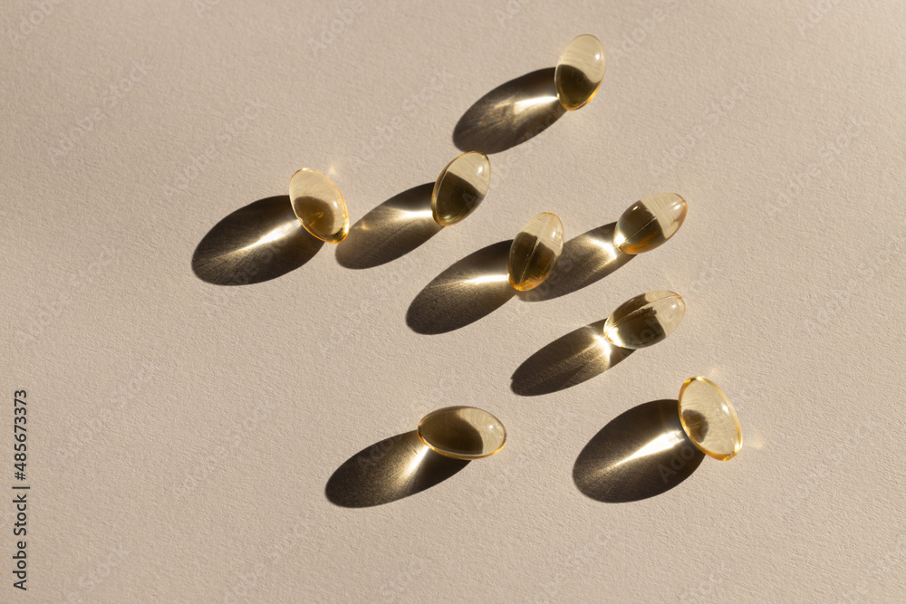 Fish oil capsules with omega 3 and vitamin D.Gold capsules on beige background.Fish oil capsules on beige background, source of vitamin D, selective focus. Omega 3