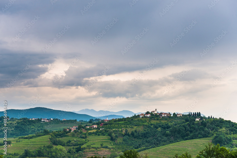 Vineyards in Goriska Brda, showing Chiesa di San Floriano del Collio and the hill top town of Gornje Cerovo, Goriska Brda, Slovenia, Europe