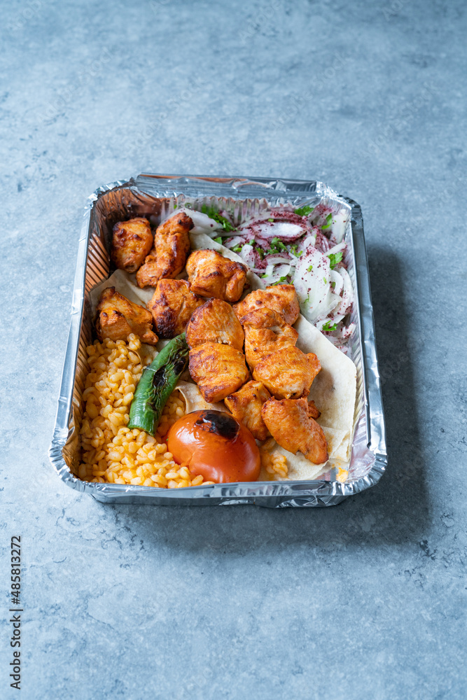 Take Away Turkish Chicken Kebab in Aluminum Foil Food Container. Take Out Dish.