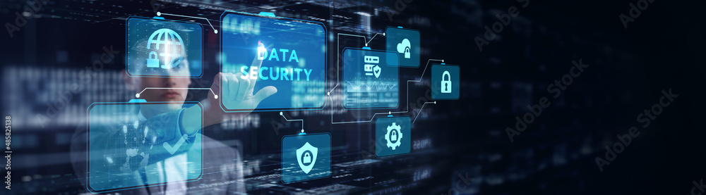 Cyber security data protection business technology privacy concept. Young businessman select the icon Data security on the virtual display.