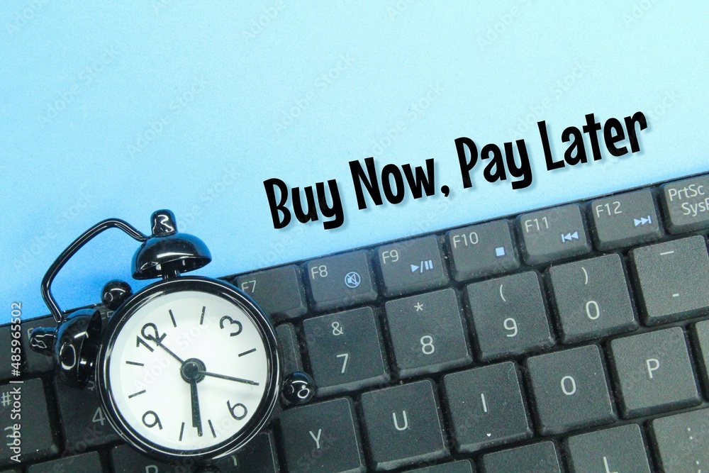 laptop keyboard and alarm clock with the words Buy now pay later