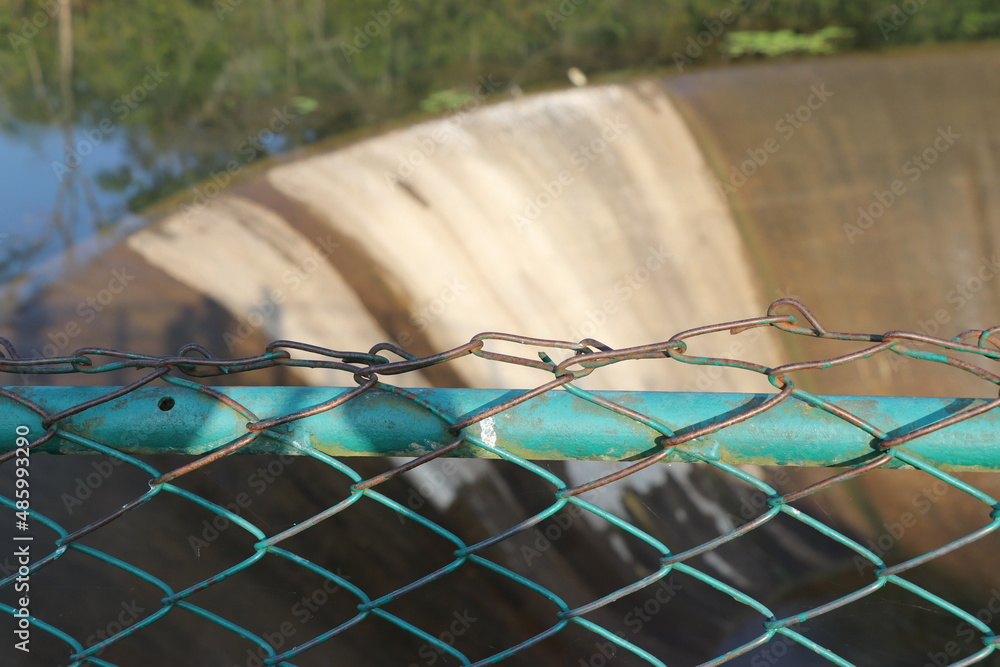 Focus on metal mesh fencing around the local dam, behind which you can see the overflow dam
