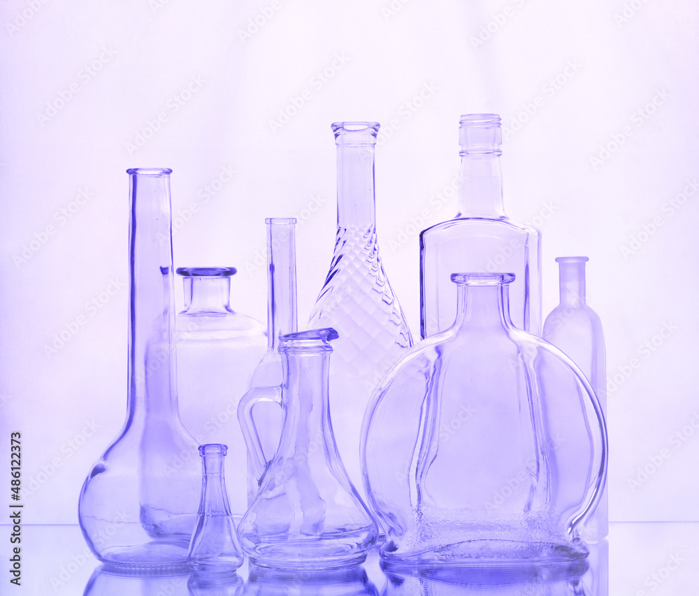 Collection of glass transparent bottles, tinted in Very Peri color of the year
