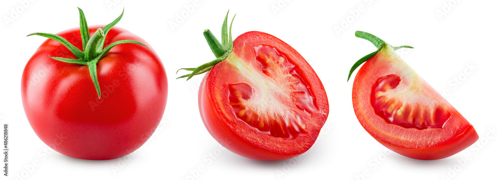 Tomato isolated. Tomato whole, half and slice on white background. Tomatoes with clipping path.