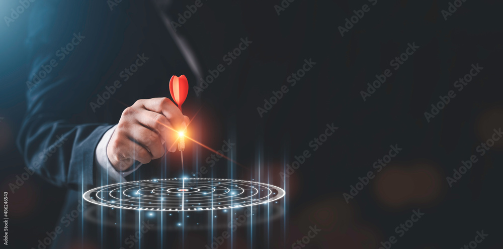 Businesswoman throwing red arrow dart to virtual target dart board. Setup objectives and target for business investment concept, Digital marketing, Business goal and technology concept.