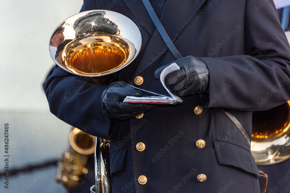 Mitglied des Marinemusikkorps der Deutschen Marine bei Verabschiedung eines Marinschiffes zum Einsatz