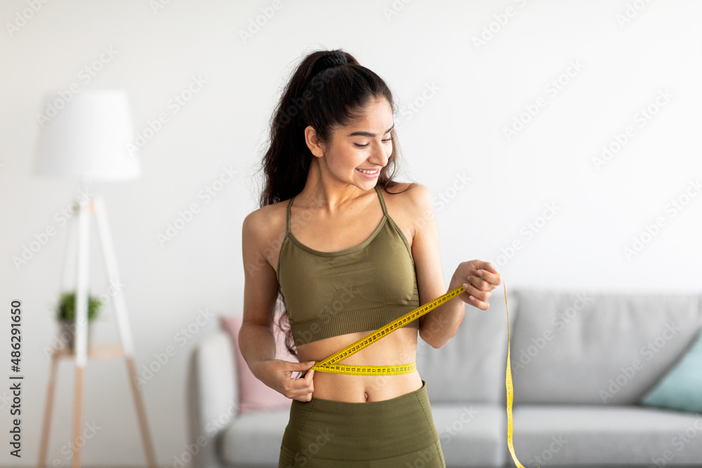 Successful weight loss concept. Fit young Indian woman in sports clothes measuring waist with tape at home