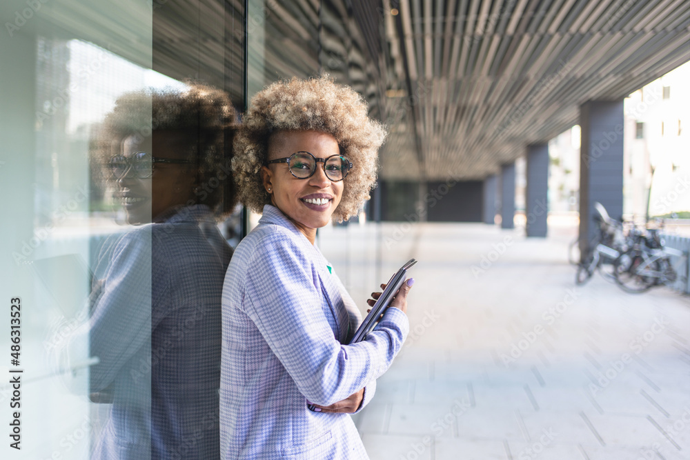 Young black business woman worker of new creative modern company standing in outdoors office area holding laptop