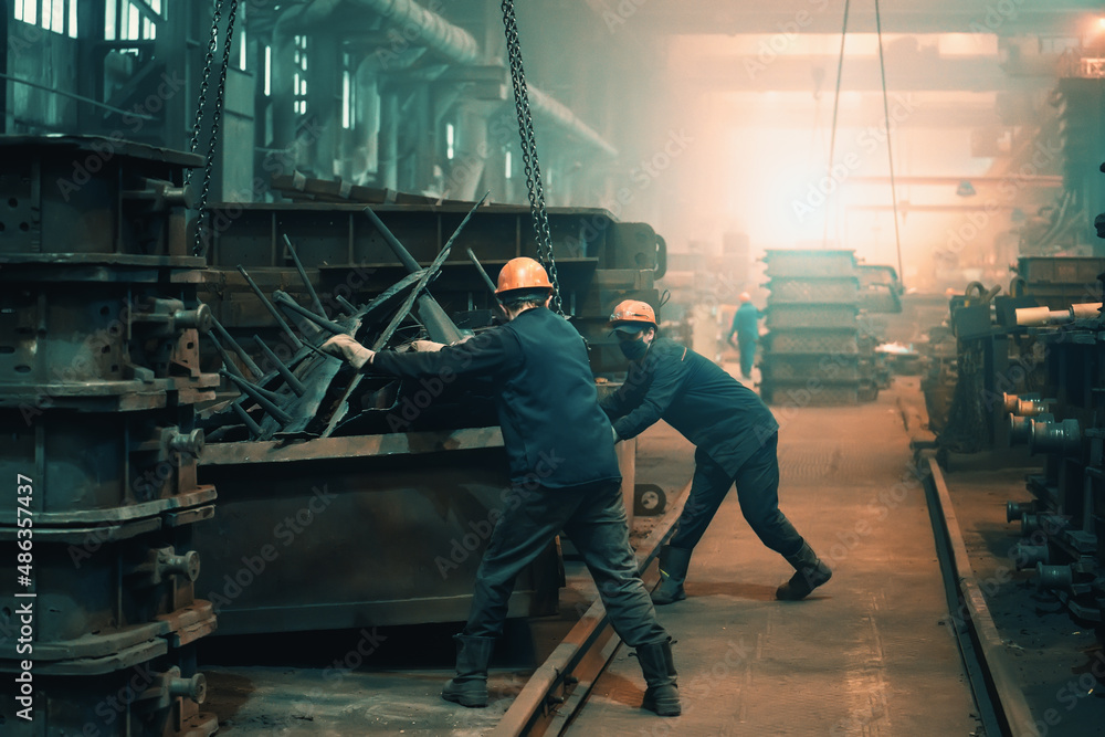 Workers at metallurgical plant. Working with scrap metal. Metal manufacturing and recycling factory.
