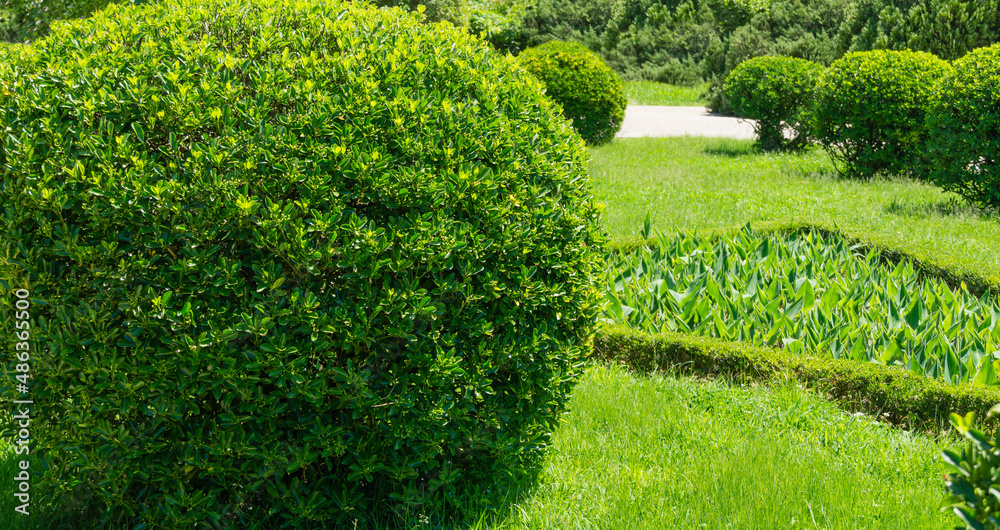 Sheared evergreens in ball Euonymus japonicus Ovatus Aureus (evergreen spindle or Japanese spindle) in Arboretum Park Southern Cultures in Sirius (Adler) Sochi.