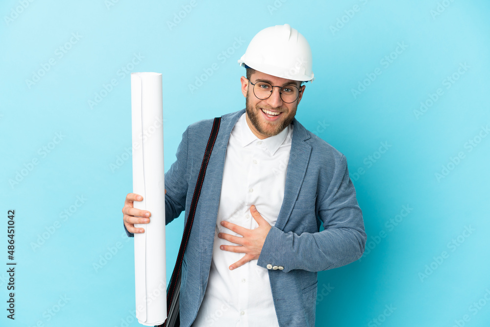 Young architect man with helmet and holding blueprints over isolated background smiling a lot