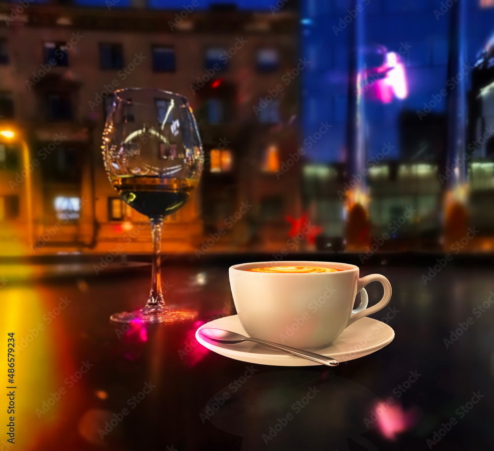 night city street cafe cup of coffee and glass of wine on table modern and vintage houses lamp blurred light urman life stile