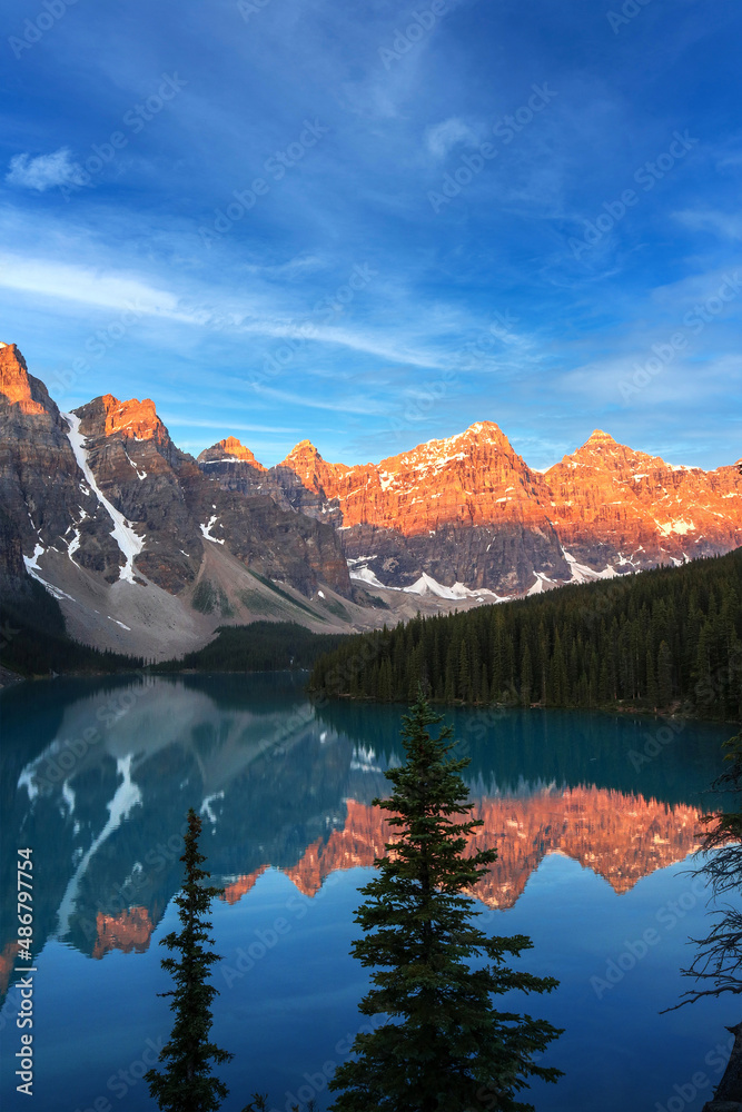 Golden Sunrise Over the Canadian Rockies at Moraine Lake in Canada