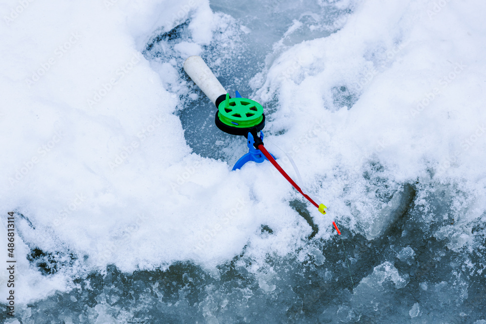 ice fishing. winter fishing. The fishing rod lies in the snow