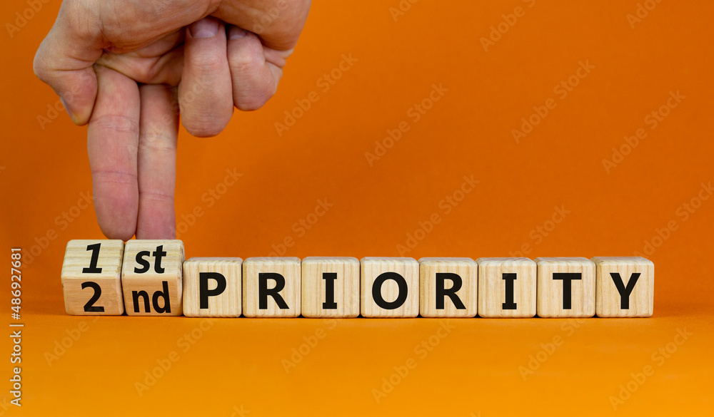 1st or 2nd priority symbol. Businessman turns wooden cubes and changes words 2nd priority to 1st priority. Beautiful orange background. Business, 1st first or 2nd second priority concept. Copy space.