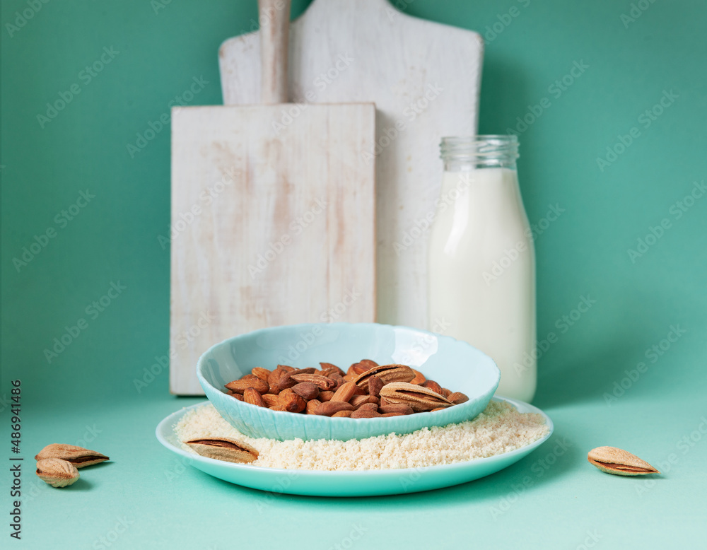 Almonds, almond milk and almond flour. Alternative type of flour containing net carbs, gluten free flour, lactose free milk, keto diet concept