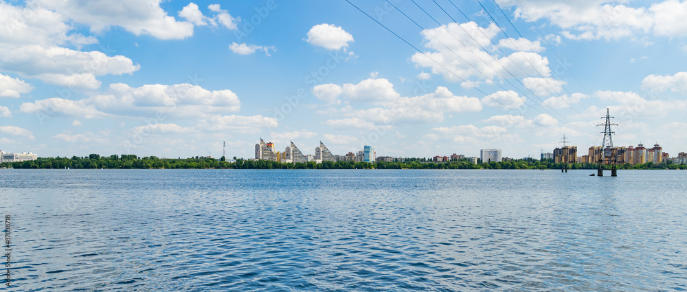 Voronezh. Blue waves of river and line of new houses on other side. White clouds in blue sky. Beautiful nature landscape with Voronezh river. There is place for your text.