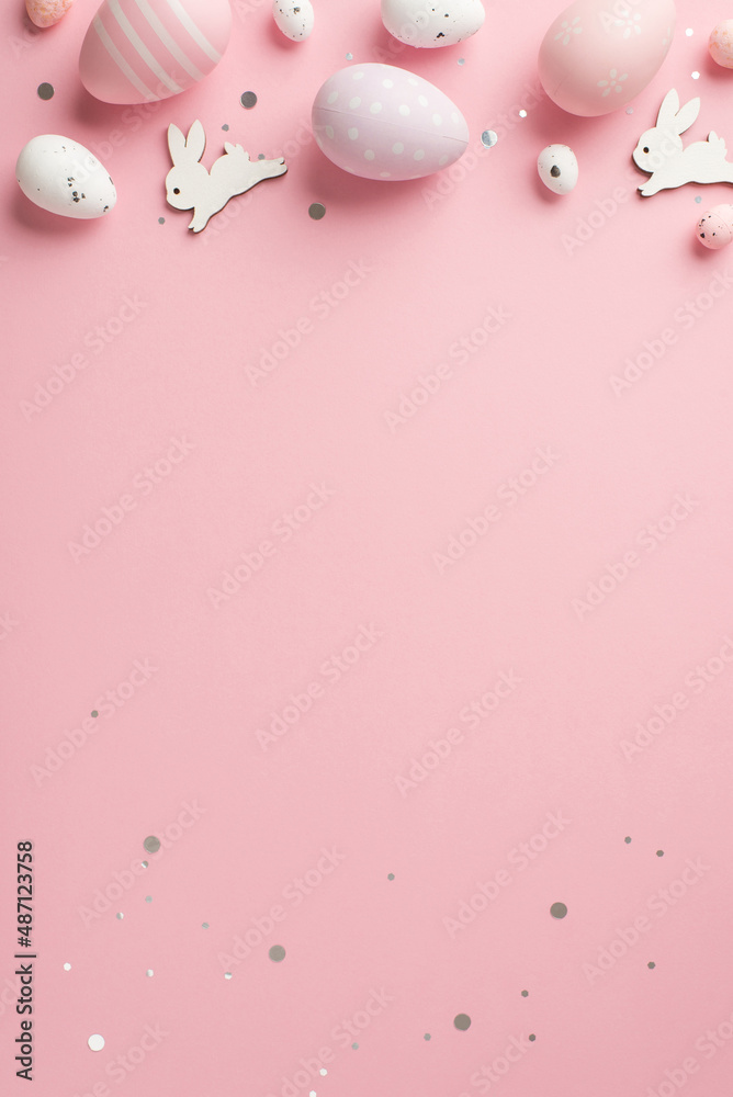 Top view vertical photo of easter decorations glowing confetti easter bunnies purple pink and white easter eggs on isolated pastel pink background with copyspace