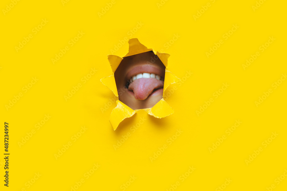 A young girl shows her tongue and teeth with lips. Torn hole in yellow paper. Copy space. The concept of mischief, disobedience and infantile behavior.