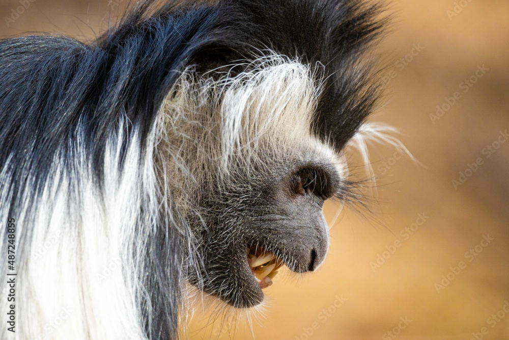 Angry colobus monkey close up portrait with teeth