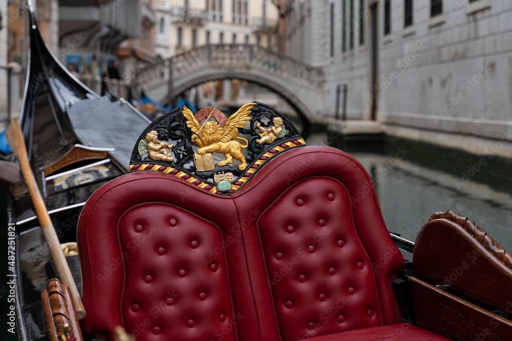 Red leather seat detail of a gondola from Venice in Italy - Travel concept