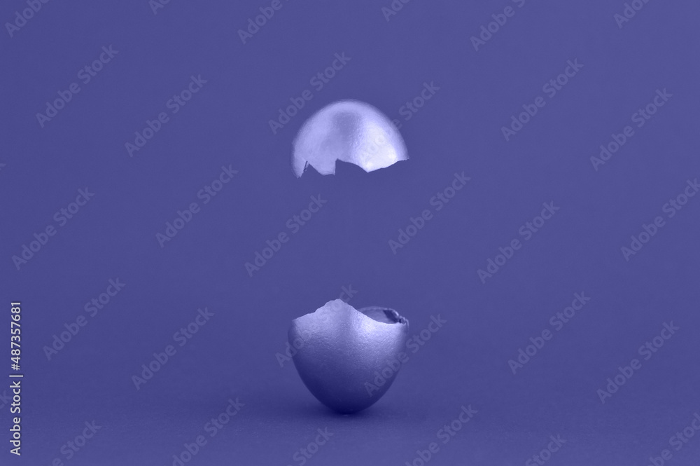 Color of the Year 2022 very pery Creative Easter egg surprise concept. Golden easter egg broken in half on a red background, levitation. Copy space.