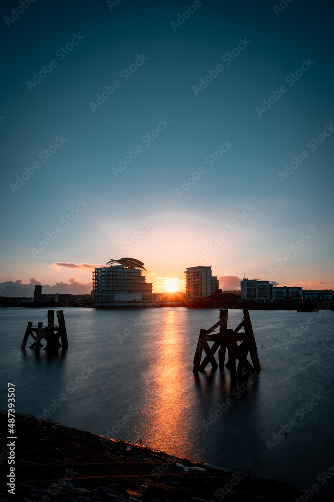 Cardiff Bay sunset, South Wales UK with a clear sky on a cold winter evening.