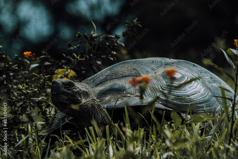 Giant Galapagos Tortoise grazing in flowers - Santa Cruz, Galapagos, Ecuador