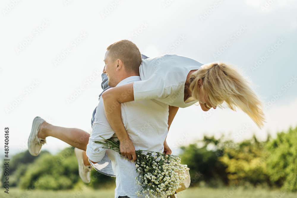 Summer Lifestyle concept. Young couple resting in field with wild flowers on summer day. Blond adult woman being carried by her boyfriend in wheat field. Couple having fun on their summer holiday.