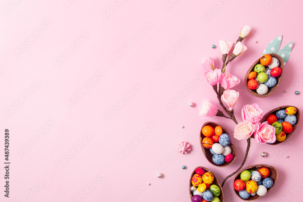 Chocolate easter eggs and decor flat lay for kids easter hunt egg concept on pink background. Sweets in the shape of an egg