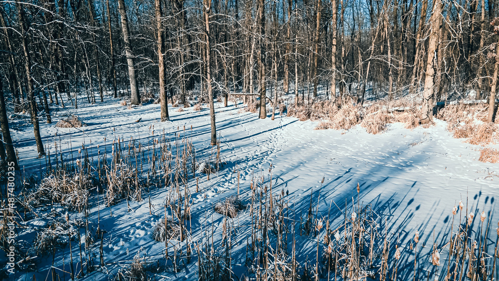 A frozen winter landscape in a natural forest