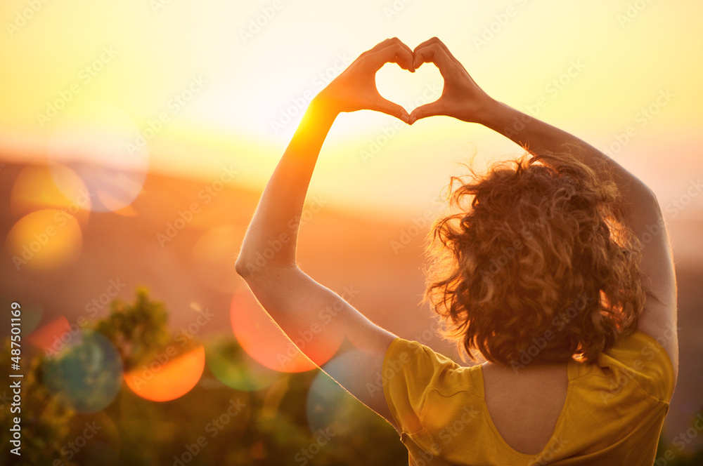 Farming will always have a place in her heart. Rearview shot of an unidentifiable woman making a heart shape with her hands over a sunset landscape.