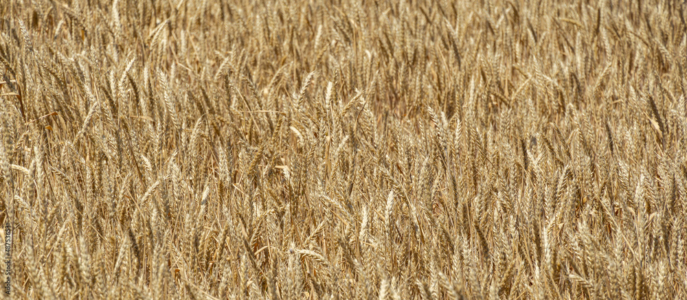 Golden ripe ears of wheat in field, rural countryside. Sunny summer day in field during harvest wheat close up. Agriculture landscape. Summer landscape, fresh wallpaper, nature background concept