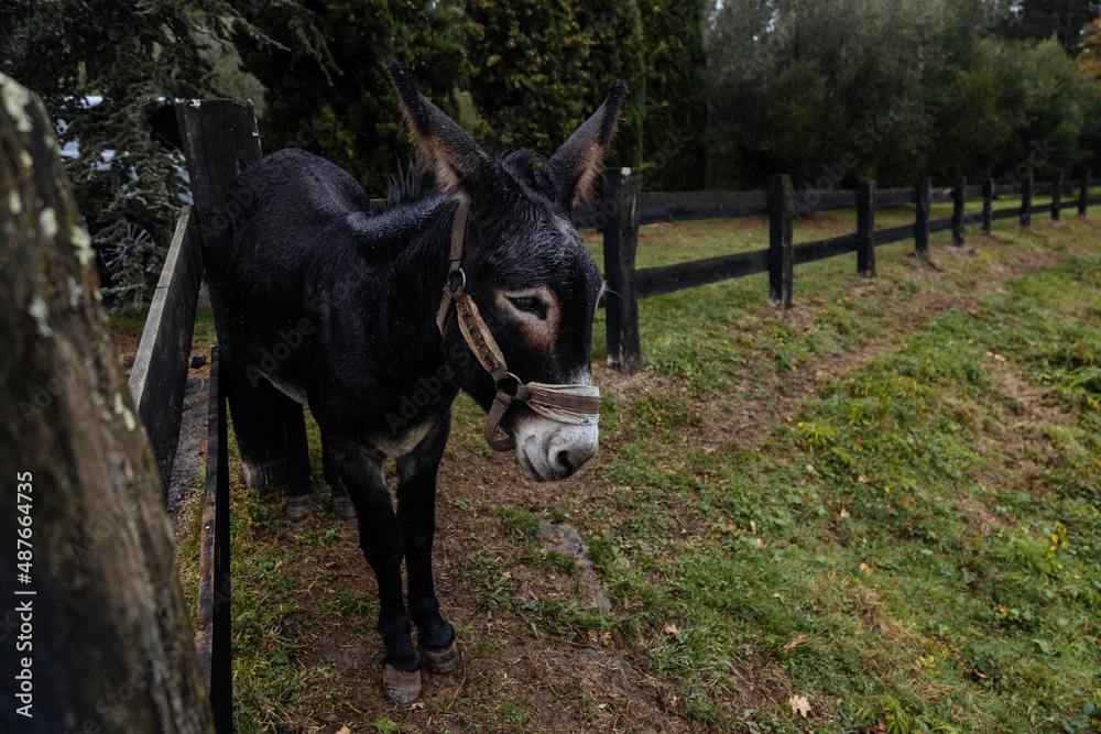 Portrait detail with a cute donkey in the mountains.Beautiful Friendly brown donkey outdoors in farm.