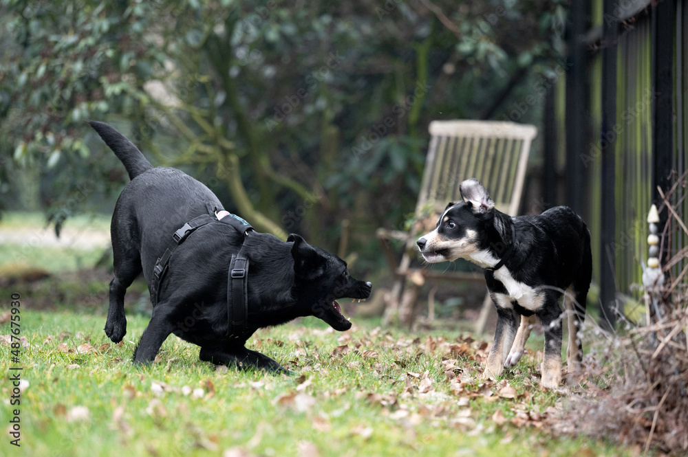 Hundebegegnung im Garten – Schwarzer Labrador und Hütehund im Konflikt, stimmungsgeladene Begegnung zwischen zwei Tieren und Klärung der Rangordnung