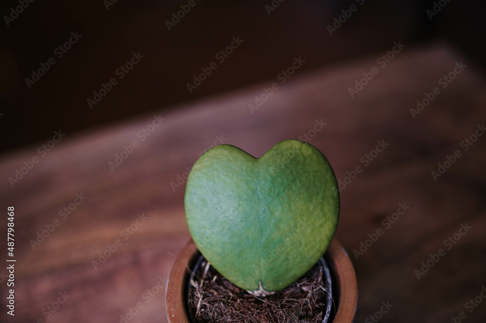 Close-up Hoyay Kerrii succulent plant with heart shaped leaf. Background with copy space.